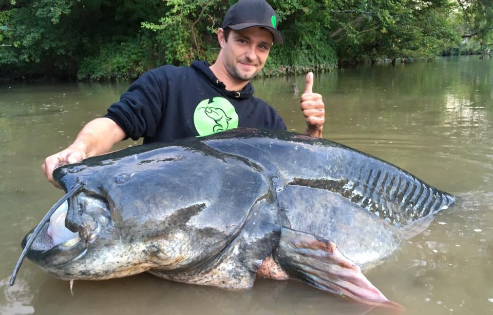 Le Tranais Jean-Christophe Conéjéro avec sa prise, un silure de 2,74 m (nouveau record du monde)
