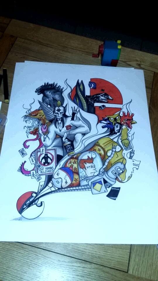 alors en référence : -le bonnet de stan (south park) -la pokeball de pokemon -bender de futurama -les dragon ball de dbz -homer des simpsons ? (vraiment pas sur parceque le nez ce n'est pas ça) -godzilla au fond à gauche -fry de futurama -le livre Death Note -encore les simpsons avec le donuts que tient le démon -la tête de hiboux et de loup je me demande si ce n'est pas zelda -le logo Koreus sur le ventre de bender -le panneau anti alien du film district 9 Katerina Kanprani, une artiste créé des objets parfaitement inutiles et frustrant il en reste d'autres qu'elle à créée