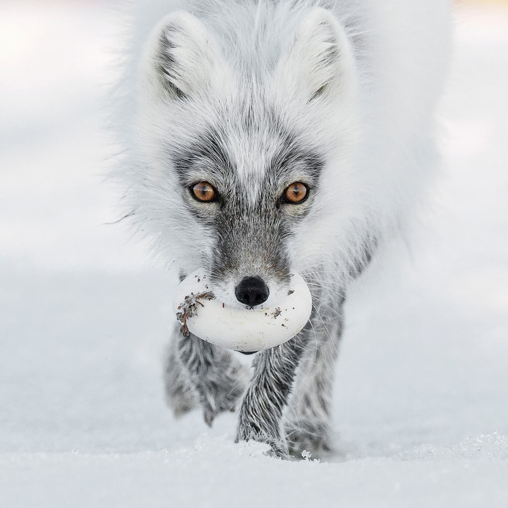 ![]() "En cette froide matinée de février, cet écureuil roux s'accorde quelques secondes de répit. Il ferme un instant les yeux, pattes jointes, pelage gonflé, puis reprend sa quête de nourriture." de MATS ANDERSSON ![]() "Ce quetzal adulte amène une mûre à ses deux petits. Ce couple d'oiseaux nichait dans un arbre dans une clairière exploitée d’un massif du Costa Rica. Le photographe israélien assistera quelques jours plus tard à l'envol de toute la famille." de TYOHAR KASTIEL ![]() "Normalement, les hippocampes se laissent porter par le courant en s'accrochant aux algues avec leur queue préhensile. Sur un récif de l’île de Sumbawa, en Indonésie, cet hippocampe doré n'a trouvé qu'un coton tige pour se stabiliser." de JUSTIN HOFMAN ![]() "Ce tigre de Sumatra âgé de 6 mois seulement a été sauvé alors que sa patte arrière était prise dans un collet dans la forêt tropicale d’Aceh (Indonésie). L'animal a été amputé. Le braconnage de ces tigres alimente toujours la médecine traditionnelle asiatique. Cet animal passera le reste de sa vie dans un zoo javanais." de STEVE WINTER ![]() "Ce renard polaire part enterrer un œuf d'oie des neiges qu'il vient de voler. Il le placera dans le sol, sous la neige qui recouvre l’île Wrangel dans l’Extrême-Orient russe." de SERGEY GORSHKOV
