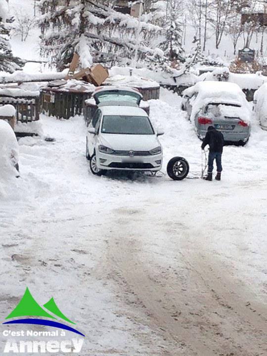 Un touriste met les chaines sur sa voiture (Grand Bornand)