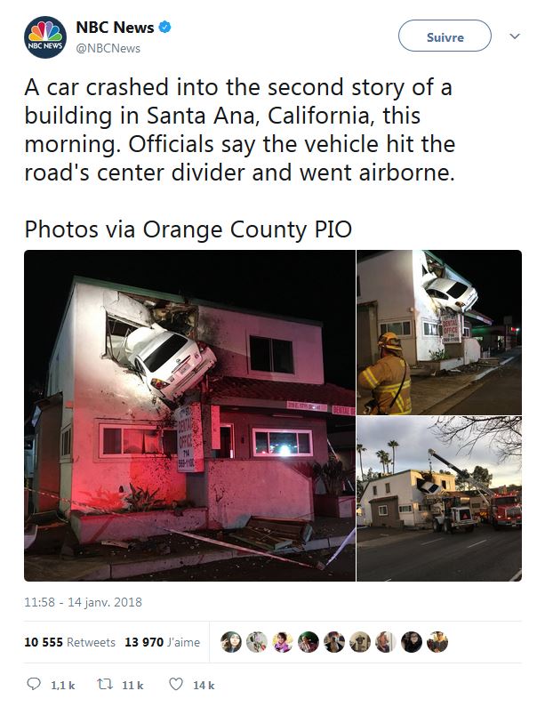 La scène rocambolesque s'est déroulée à Santa Ana (Californie, Etats-Unis). Une voiture a fait une sortie de route improbable après avoir heurté la glissière centrale en béton. Suite à ce choc, allié à une vitesse excessive, le véhicule et ses occupants ont été propulsés à plusieurs mètres du sol avant de finir sa course en plein dans un cabinet dentaire. ![]()