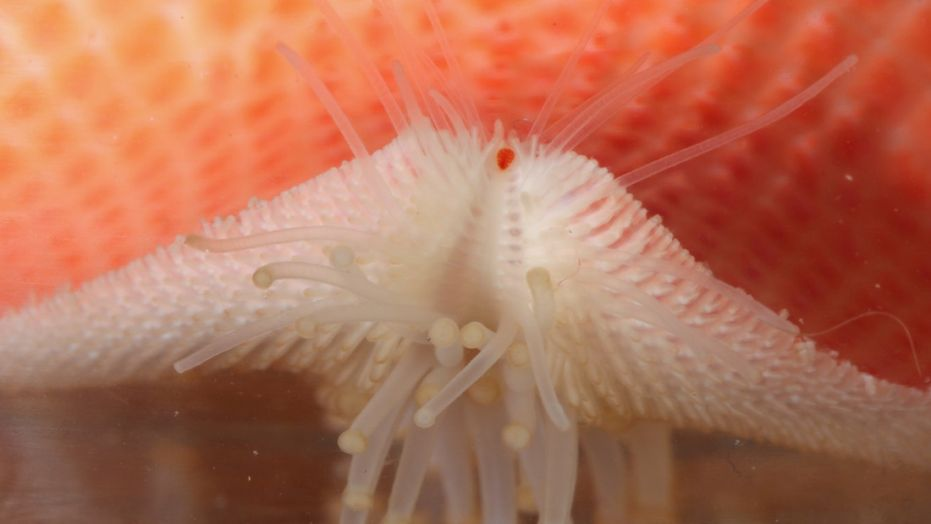 Coucou, l'étoile de mer vous regarde... par le bout de son bras (L'oeil c'est le point rouge).