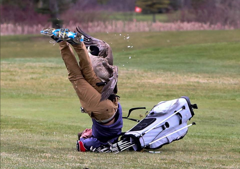 Les golfeurs évitaient avec prudence un nid avec une oie, gardant un oeil dessus, quand l'oie de garde leur a foncé dessus par derrière. ![]() ![]() Se relevant, le golfeur s'est pris les pieds et s'est vautré une seconde fois, l'oie n'en demandait pas tant... ![]()
