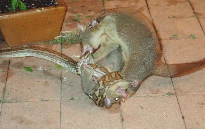 En Australie, maman possum n'accepte pas que le python lui vole son bébé qu'elle portait sur son dos.