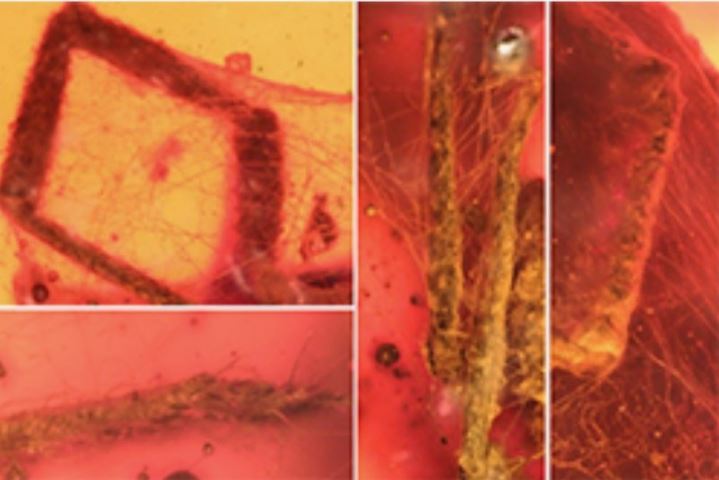 Découverte d'une tique piegée dans la soie d'une araignée, vieilles de 100 millions d'années, figées dans de l'ambre.