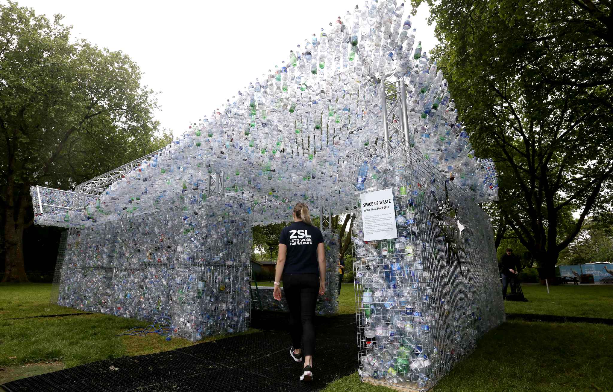 Fiona Llewellyn, chef de projet marine chez ZSL, entre dans l'œuvre Space of Waste, une installation artistique mettant en lumière le problème de la pollution plastique, au zoo de Londres, en Grande-Bretagne, le 24 mai 2018. Le travail de l'artiste et architecte Nick Wood est fabriqué à partir de 15 000 bouteilles jetées dans Londres et ses rivières.