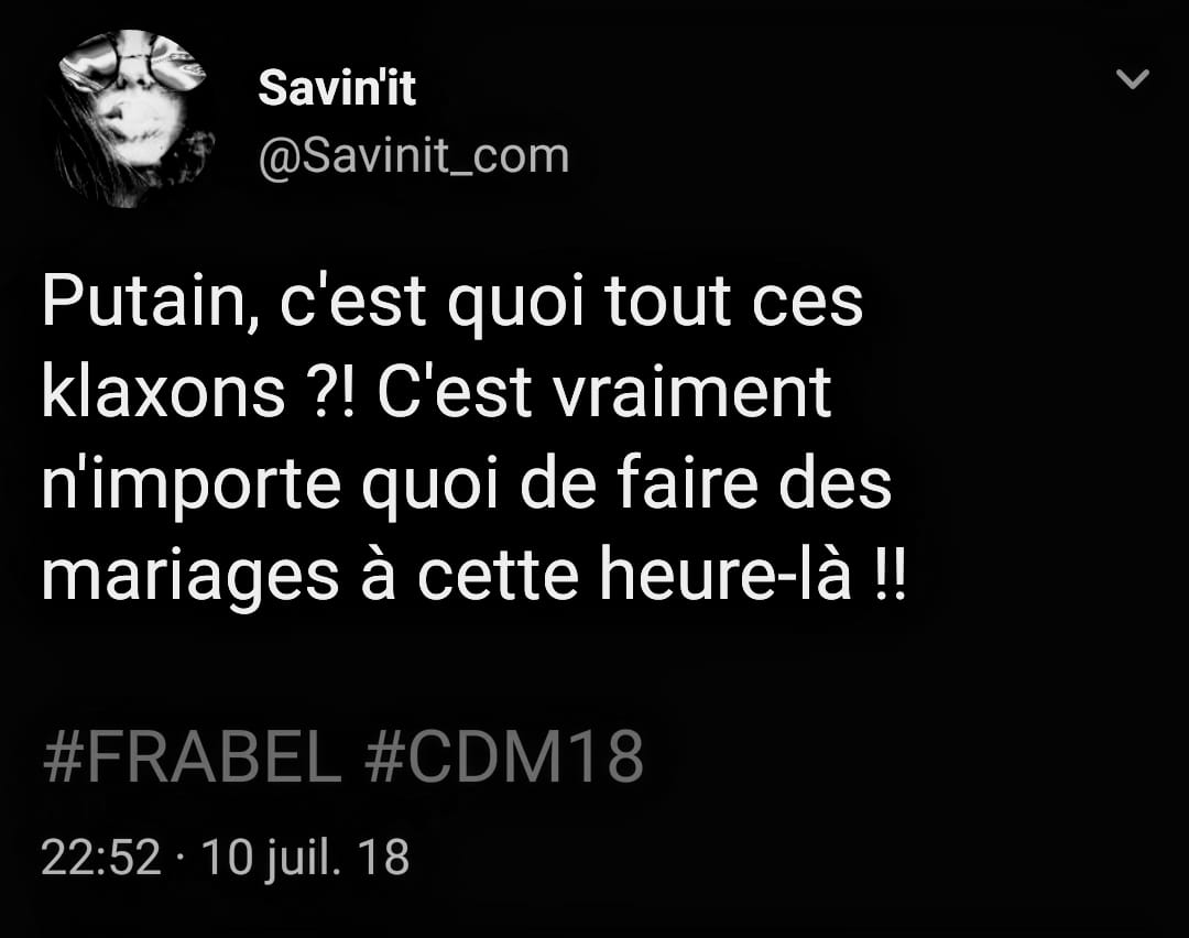 Surtout que vous foutez un bordel monstre, vous les footeux Pi t'imagine si moi par exemple j'étais fan de patin a glace, et que le français devenait champion du monde, je prend ma bagnole a 22h jusqu'a minuit pour klaxonner et gueuler comme un idiot dans les rues ce qui ce passerait? PPF :