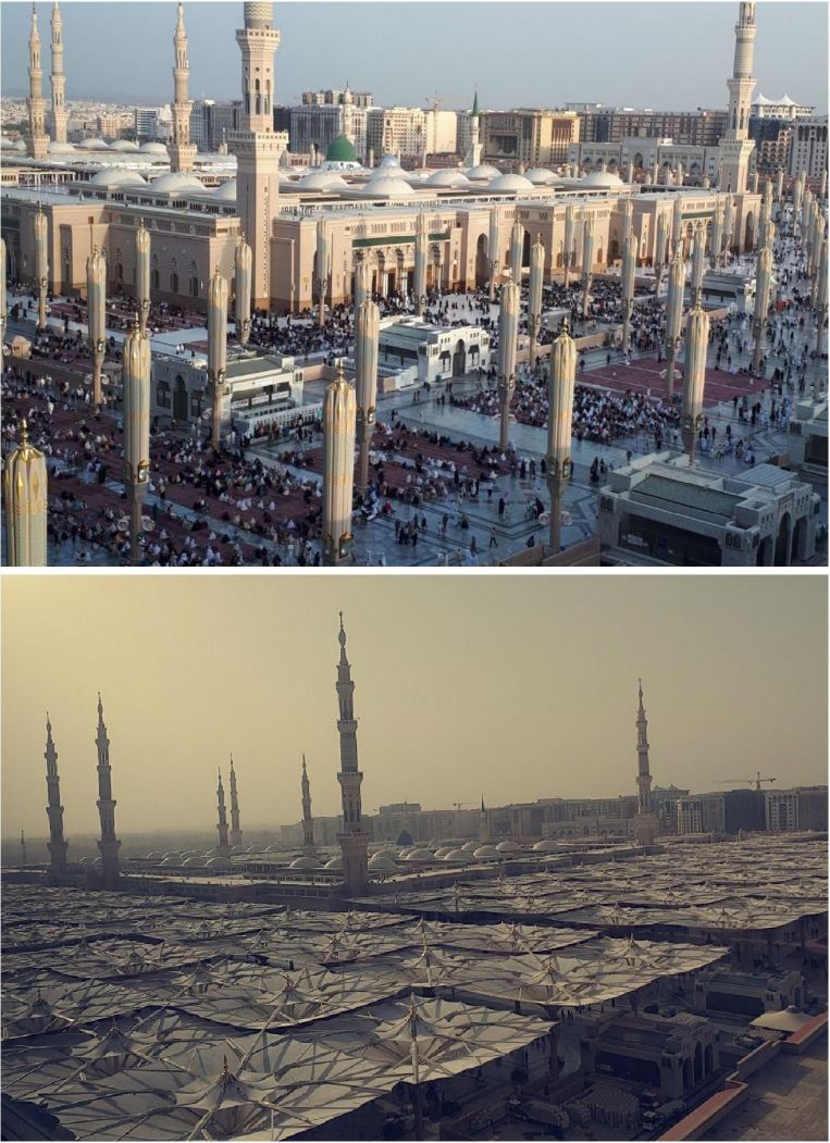 La Mosquée du Prophète à Médine (Arabie Saoudite) avec et sans les parasoles géants ouverts