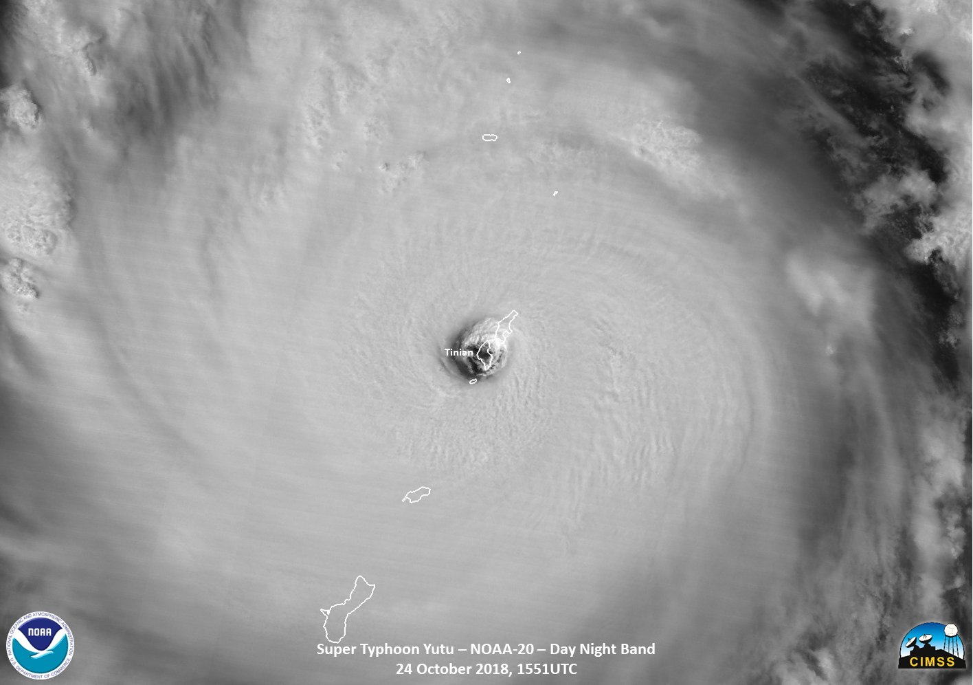Image du super typhon Yutu éclairé par la lumière de la lune en train de passer pile au-dessus de l'île de Tinian.