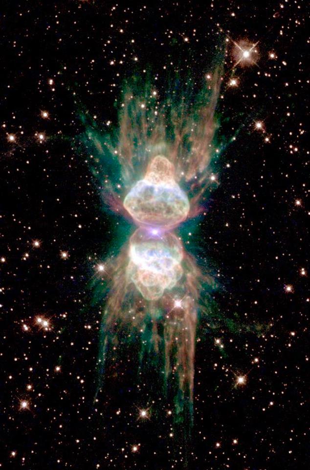 ![]() L’impressionnante nébuleuse de la Fourmi, longue de 22’000 milliards de km, et qui fait un peu penser à la tête et au corps d’une fourmi. La nébuleuse, située à 3100 années-lumière de nous, est issue d'une étoile en fin de vie et d'interactions complexes de matériaux en son cœur. Un phénomène rare lié à la mort d’une étoile a été découvert dans le cadre des observations de l’observatoire spatial Herschel de l’ESA : une émission laser inhabituelle issue de la célèbre nébuleuse, suggérant la présence d’une étoile binaire cachée en son cœur. Lorsque les étoiles de masse moyenne à faible (comme notre soleil) arrivent en fin de vie, elles finissent par devenir des étoiles naines blanches et denses. Ce faisant, elles rejettent leurs couches extérieures de gaz et de poussières dans l’espace, créant ainsi un amas de motifs complexes, appelé nébuleuse planétaire. Crédits : NASA/Hubble, ESA ![]() ![]()