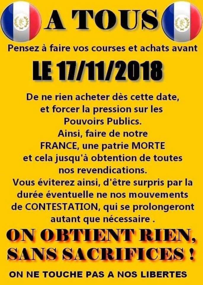 "Pensez a faire vos courses et vos achats avant!" Donc l'affiche invite a acheter la veille ce qui sera empêché par la manif d'être acheté le lendemain? Ca sert a rien alors du coup...C'est un bon celui qui a fait cette affiche! C'est bien a l'image de l'inutilité de cette manif! "Faites vôtre plein le lundi, vous ne pourrez pas le faire le mardi! AAAAAH AAAAAAAAH!!!!! Ca va faire chier le gouvernement!" Lol! ![]()