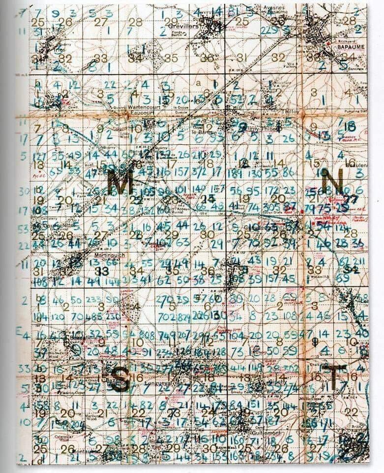 ![]() PPF : Carte trouvée sur Reddit de la bataille de la somme, chaque zone fait 250 mètres carré, le chiffre bleu dans ces zones représente le nombre de corps qui y ont été retrouvés. ![]()