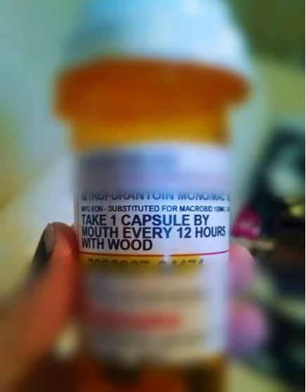 Un médicament à prendre en mangeant du bois ("wood" au lieu de "food" sans doute)