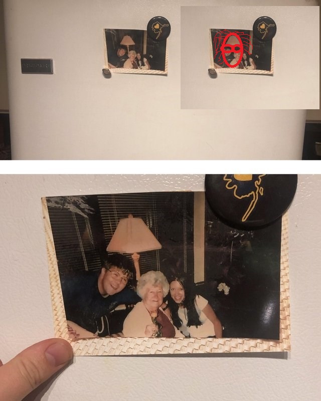 Pour l'image, la tete de lampe ça fait un front,les cheveux du mec en noir et le noir de l'autre côté sous la tete de lampe ça fait les yeux et le visage du mec et de la vieille ça fait des joues! Regarde de très loin tu verra tout de suite! ppf: ![]()