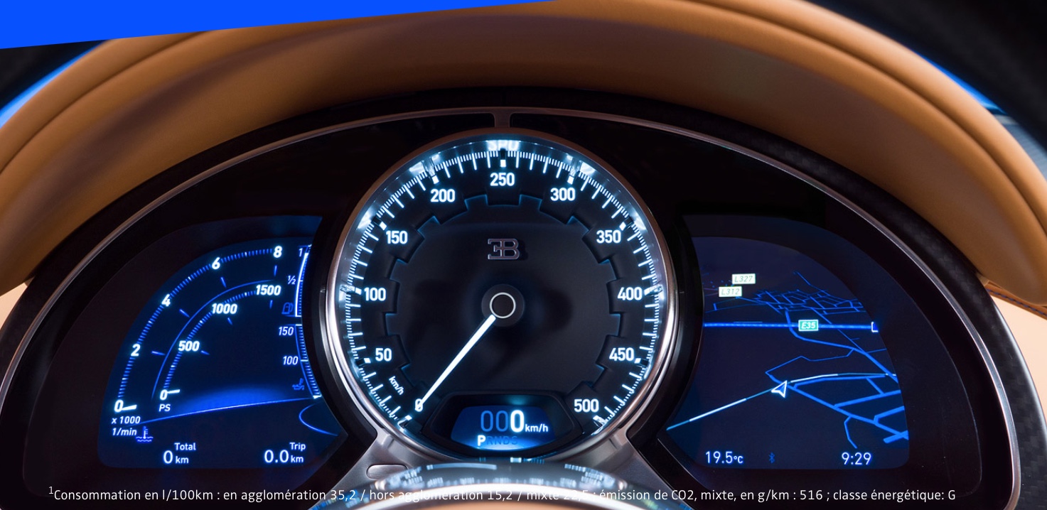 Nouvelle Bugatti Chiron, moteur W16 - 8 litres, 1500 chevaux. Vitesse max 450 km/h. La voiture consommerai 100L pour 100km à pleine puissance.