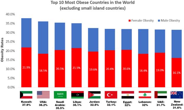 Tu les as trouvé ou ? Populations Pas Fines : Les pays avec les plus haut % d'obèses : 8 pays sur 10 sont de la région du Moyen Orient. La culture de mal-bouffe américaine ne serait pas la seule explication du coup ![]() Source