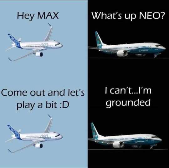 ![]() Et pour les anglophobes : - [Airbus A320neo] Hey MAX ! - [Boeing 737 MAX] Quoi de neuf neo ? - [Airbus A320neo] Sors de là et jouons un peu ! - [Boeing 737 MAX] Je peux pas... Je suis cloué au sol. A savoir qu'il y a un petit jeu de mots puisque "grounded" signifie aussi "être puni"