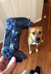 Le chien, il a jouer avec la manette. Surement pour faire comme son maître, mais la elle est toute mordillée et baveuse. Ps4 Pour Faim ![]()