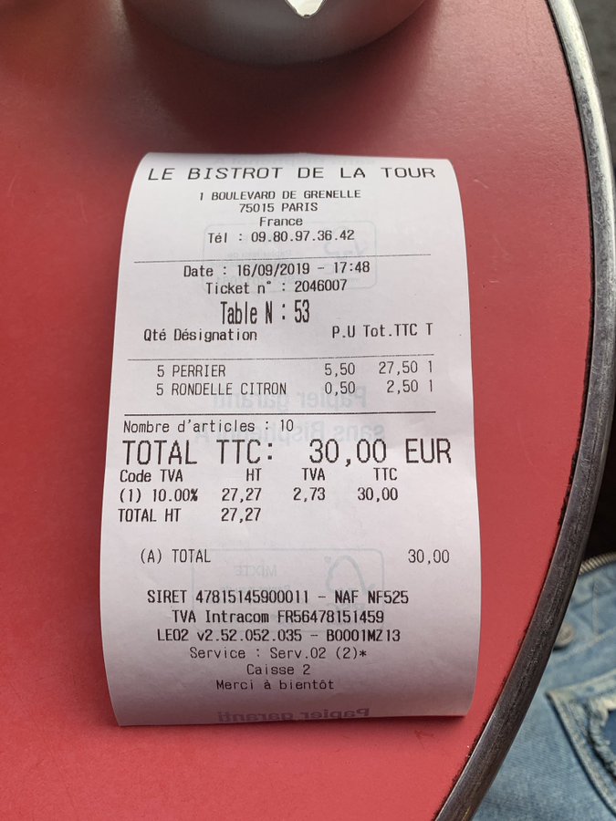 C'est moi, ou c'est fait exprès, mais l'ombre semble former un fauteuil roulant !!?? ![]() 5,5€ le perrier + 0,5€ la rondelle qui va avec, c'est peut être la norme.. Ça doit faire trop longtemps que je ne suis pas allé sur Paris..!