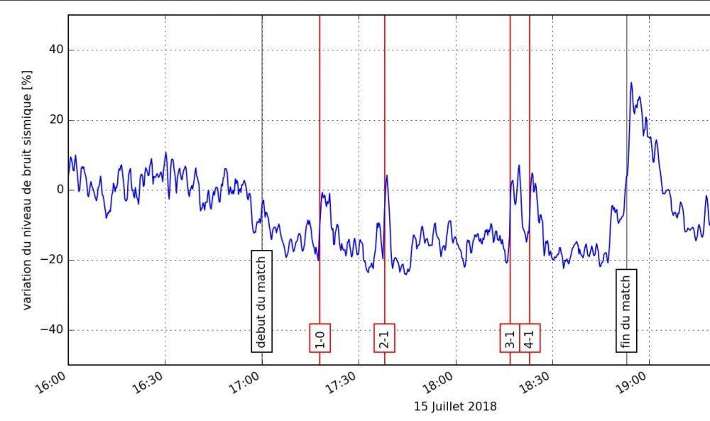 Cet enregistrement sismographique montre des pics correspondants à chaque but et au coup de sifflet final.