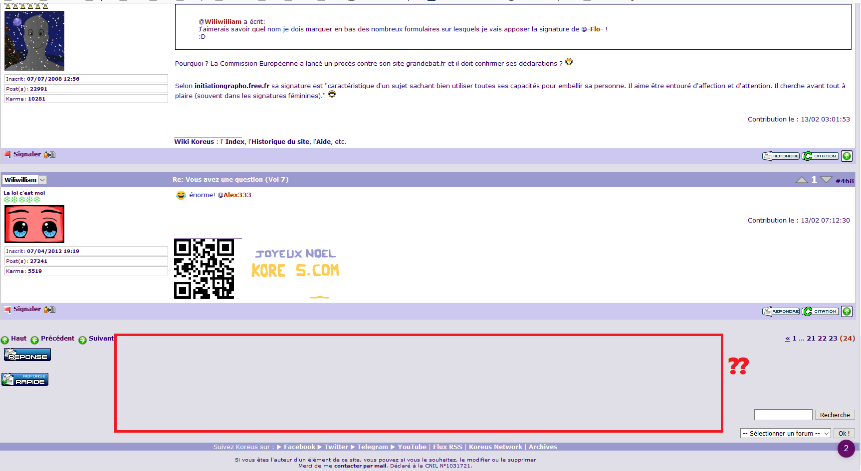D'accord avec toi, je suis certain que ça vient de moi. Mais aucune idée de l'origine. Je n'ai jamais le réflexe de tester sur un autre navigateur ! Alors je suis allé sur Chrome, et la fenêtre est revenue. Mais sur Firefox, toujours rien... Sachant que : - samedi, la fenêtre était là - dimanche elle avait disparu - je n'ai rien touché entre temps (il y a eu une MàJ de Mozilla, mais ça n'a jamais rien désactivé comme ça auparavant) - j'ai essayé de me déco/reco à Koreus, ça n'a rien changé As-tu d'autres idées ?^^' Où pourrais-je chercher pour résoudre ce truc ? @Baba-Yaga Eddy Mitchell & Les Chaussettes Noires - Tu parles trop (T'es juste jalouse parce que j'ai plus de nouvelles pages que toi. :p)
