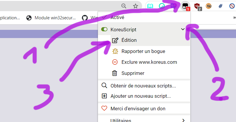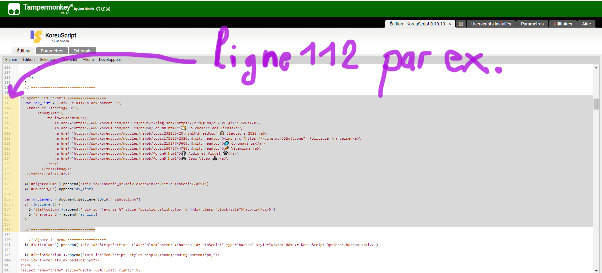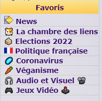 Une petite nouveauté que je propose, libre à chacun de modifier ses favoris ! ![]() Code à rajouter : // Ajoute les favoris ================== var fav_list = '<div class="blockContent" >\ <table cellspacing="0">\ <tbody><tr>\ <td id="usermenu">\ <a href="https://www.koreus.com/modules/news/"><img src="https://k.img.mu/c5k9VE.gif"> News</a>\ <a href="https://www.koreus.com/modules/newbb/forum8.html"> La chambre des liens</a>\<a href="https://www.koreus.com/modules/newbb/topic232166-20.html#threadtop"> Elections 2022</a>\<a href="https://www.koreus.com/modules/newbb/topic171028-2320.html#threadtop"><img src="https://k.img.mu/JSSuJE.png"> Politique française</a>\ <a href="https://www.koreus.com/modules/newbb/topic215277-3600.html#threadtop"> Coronavirus</a>\<a href="https://www.koreus.com/modules/newbb/topic160787-4780.html#threadtop"> Véganisme</a>\<a href="https://www.koreus.com/modules/newbb/forum6.html"> Audio et Visuel </a>\<a href="https://www.koreus.com/modules/newbb/forum5.html"> Jeux Vidéo </a>\</td>\ </tr></tbody>\ </table></div></div>' $('#rightcolumn').prepend('<div id="Favoris_D"><div class="blockTitle">Favoris</div>') $('#Favoris_D').append(fav_list) var myElement = document.getElementById("rightcolumn") if (!myElement) { $('#leftcolumn').append('<div id="Favoris_G" style="position:sticky;top: 0"><div class="blockTitle">Favoris</div>') $('#Favoris_G').append(fav_list) } // ============================== TUTO : 1. Restez sur koreus.com 2. Suivre les étapes de l'image : ![]() 3. Rajouter le code joint ci-dessus: ![]() 4. Fichier -> Enregistrer Edit : Ah oui et si vous utilisez le tème Koreus look, j'ai changé la ligne 57 : var CSSLook = 'td#rightcolumn div.blockTitle{color:#306;background:linear-gradient(#fbe38b,#fecc53);padding:4px 3px}td#rightcolumn div.blockContent li:hover{background-color:#FFF;box-shadow:0 0 5px 3px rgba(0,0,0,0.2)}td#leftcolumn div.blockTitle{color:#306;background:linear-gradient(#fbe38b,#fecc53);padding:4px 3px}td#usermenu{padding:0}td#leftcolumn div.blockContent{padding:0}td#usermenu a{transition:background .3s;padding:2px 0 2px 6px;border-right:0;border-color:#ccc}td#leftcolumn div.blockContent{font-size:10px}td#mainmenu{padding:0}td#mainmenu a{transition:background .3s;padding:2px 0 2px 6px;border-right:0}td#mainmenu a.menuMain{border-right:0;padding-left:6px}td#mainmenu a.menuTop{border-right:0;border-bottom:1px solid #ccc;padding-left:6px}td#mainmenu a.menuSub{border-right:0;background-color:#E0DFE7;border-left:10px solid #ccc;border-color:#ccc;padding-left:8px}td#usermenu a:hover{background-color:#FFF;box-shadow:0 0 5px 3px rgba(0,0,0,0.2)}td#mainmenu a.menuSub:hover,a.menuTop:hover,a.menuMain:hover{background-color:#FFF;box-shadow:0 0 5px 3px rgba(0,0,0,0.2)}td#leftcolumn div.blockContent ul{padding:0;margin:0}td#leftcolumn div.blockContent li{margin:0;transition:background .3s;padding:2px 0 2px 6px;border-bottom:1px solid #ccc;list-style:none}td#leftcolumn div.blockContent li:hover{background-color:#FFF;box-shadow:0 0 5px 3px rgba(0,0,0,0.2)}td#centercolumn div#content table.outer tbody tr.odd td{vertical-align:middle}td#centercolumn div#content table.outer tbody tr.even td{vertical-align:middle}table.index_category tbody .head{background:linear-gradient(#BEBEE4,#9A9ACE);font-weight:700;box-shadow:0 2px 6px 0 rgba(0,0,0,0.15);height:25px}table.index_category td{padding:3px;vertical-align:middle}.item{margin-left:10px}.itemFoot{margin-left:10px}td[width="4%"],td[valign="middle"]{vertical-align:middle}table.index_category{margin-top:0;margin-bottom:0}td#centercolumn div#content div#cat_1{background-color:#fff}div[style="margin-left: auto; margin-right: auto;text-align:center; width:500px"]{margin-left:auto!important;margin-right:20px!important;text-align:right!important;width:500px!important}select{background-color:#FFF;border-top-left-radius:4px;box-shadow:0 2px 6px 0 rgba(0,0,0,0.15);z-index:1;border:0!important;cursor:pointer}div.dropdown .menu,div.dropdown .userbar{padding-left:0;text-align:center}table.outer > tbody > tr > th > div{padding-left:10px}#mainoption option{box-shadow:0 1px 6px 0 rgba(0,0,0,0.15);padding:5px}table.outer{border:0}table.outer > tbody > tr:nth-child(4){box-shadow:0 6px 4px 0 rgba(0,0,0,0.15)}table.outer > tbody > tr:nth-child(1) > th{padding-right:10px}div#content{margin-left:10px}#forumoption option{box-shadow:0 1px 6px 0 rgba(0,0,0,0.15);padding:3px 5px}#content > div:nth-child(5){padding-left:20px}#content div.dropdown #topicoption{margin-left:20px}#content > div:nth-child(13){padding-left:20px}table.outer > tbody > tr:nth-child(4){border-bottom-right-radius:15px;border-bottom-left-radius:15px}table.outer > tbody > tr{border-bottom-right-radius:0;border-bottom-left-radius:0}table.outer > tbody > tr:nth-child(4) > td:nth-child(1){border-bottom-left-radius:15px}table.outer > tbody > tr:nth-child(4) > td:nth-child(2){border-bottom-right-radius:15px;padding-right:10px}table.outer > tbody > tr:nth-child(1) > th:nth-child(1){border-top-left-radius:15px}table.outer > tbody > tr:nth-child(1) > th:nth-child(3){border-top-right-radius:15px}td#centercolumn div#content table.outer tbody tr.odd td{border-bottom-right-radius:0;border-bottom-left-radius:0}td#centercolumn div#content table.outer tbody tr.odd{border-bottom-right-radius:0;border-bottom-left-radius:0;box-shadow:none}span.itemPoster{padding:5px 1px 4px 5px;margin-right:5px;background-color:#E0DFE7;border-top-left-radius:10px;border-top-right-radius:10px}div.item{border-left:1px solid #c8c8c8;border-right:1px solid #c8c8c8;border-top-left-radius:10px;border-top-right-radius:10px;border-bottom-width:1px;border-bottom-color:#E0DFE7}div.itemHead{border-top-left-radius:10px;border-top-right-radius:10px;border-top-width:1px}div.item > div > h1{padding-left:10px}div.itemFoot{border-bottom-left-radius:10px;border-bottom-right-radius:10px;border-bottom-width:1px;box-shadow:0 6px 4px 0 rgba(0,0,0,0.15);background-color:#fff}div.itemFoot > span{padding-right:10px}#centerc