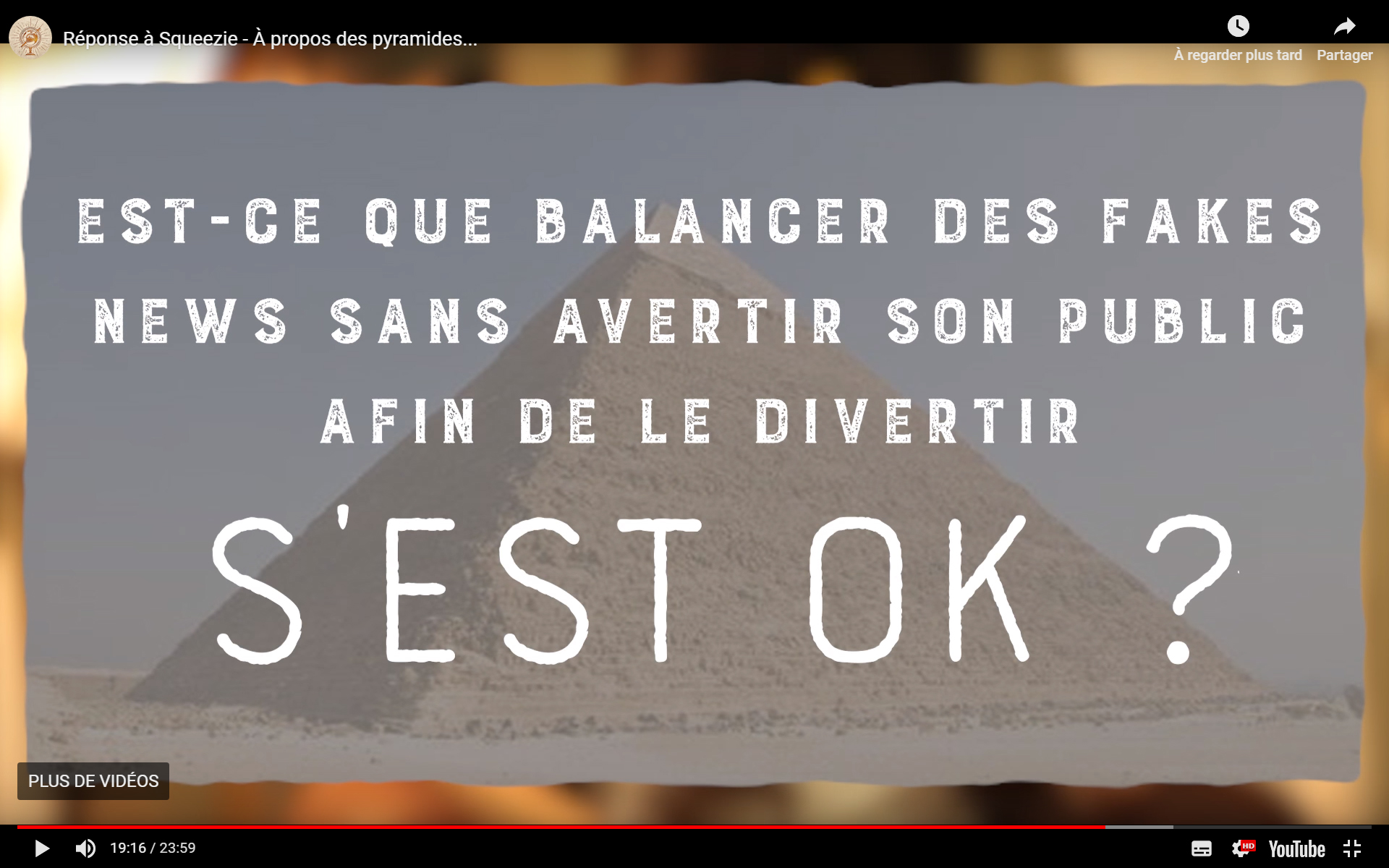 le probleme c'est que les mecs qui ont pondu la révélation des pyramide sont des escroc, et que squeezie envoi un lien vers une de leurs vidéo qui est payante a 3 euros 14 et qui n'est même pas la source de ses dire, donc disons qu'1% des 4.5 millions de vue soit passé a la caisse car après tout 3,14 c est pas cher si on veut en "apprendre" plus ben ça fait tout de même la petite somme de 141000 euros. Et s'il voulait présenter des truc farfelus c'est pas ce qu'il manque, entre ceux qui pensent que c’était des silo a grain, une centrale électrique, ou encore un systeme pour pomper l'eau. Au lieu de ça on a le droit a des hypothèses basé sur des mensonges par omission avec petit coup de com pour vendre le second "documentaire" de pouillard (déjà financé via demande de don).