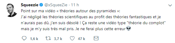Oui comme tu l'as dis il a fait plusieurs vidéos de ce genre ces derniers temps mais c'était toujours avec du recul ou en se foutant de la gueule des théories qu'il expliquait. Là ce n'était clairement pas le cas et il suffisait de regarder les commentaires de sa vidéo pour voir l'impacte que ça a eu. Avant que d'autres youtubeurs ne réagissent, la majorité des commentaires étaient fascinés de ce qu'ils ont appris. Ceux indiquant que la révélation des pyramides est une source tout sauf fiable étaient largement minoritaires et se faisaient insulter. On est loin de ses vidéos où les commentaires se foutent de la gueule des platistes ou autres. Depuis que "la youtubeuse" comme tu le dis si bien et Defakator ont réagi, les commentaires de la vidéo de Squeezie ont bien changé et heureusement. On entend déjà assez de conneries et de fake news comme ça. Et parler de "récup dégueulasse" c'est un peu facile. Sa vidéo apporte des explications claires sur un sujet qu'elle connaît bien. Elle y gagne certainement des abonnés et des vues mais c'est clairement mérité je trouve.