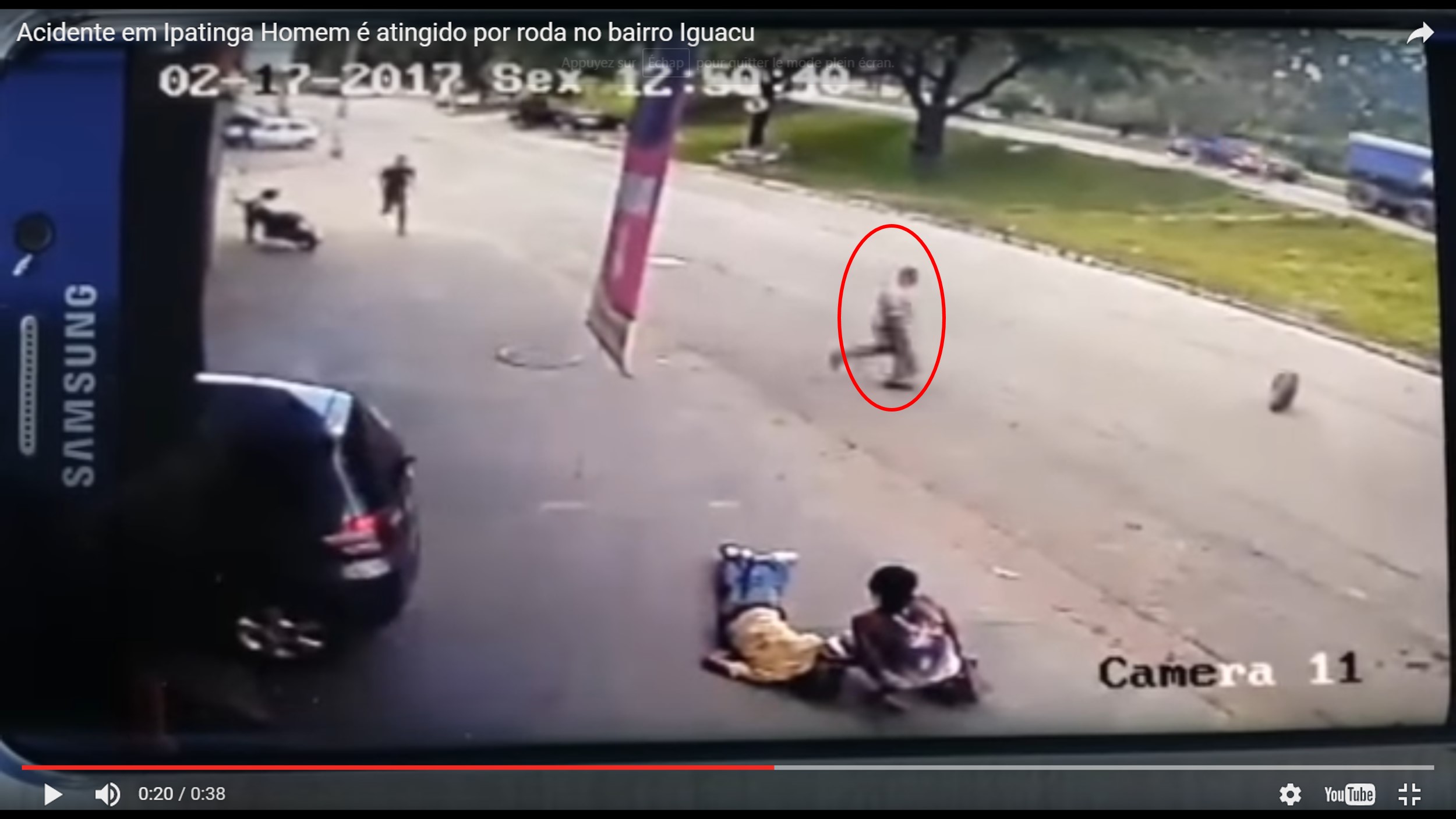 Tire hits in head of man passing street 17/2/2017 Via korzik.net Selon la description youtube, l'homme de 50 ans a survécu Citation : A security camera at an establishment in front of the site reported the accident. Roberto and the young woman walk on the sidewalk, when the tire appears to the left, descends a grassy slope, hits the asphalt and hits the head of the pedestrian, who immediately drops to the ground.