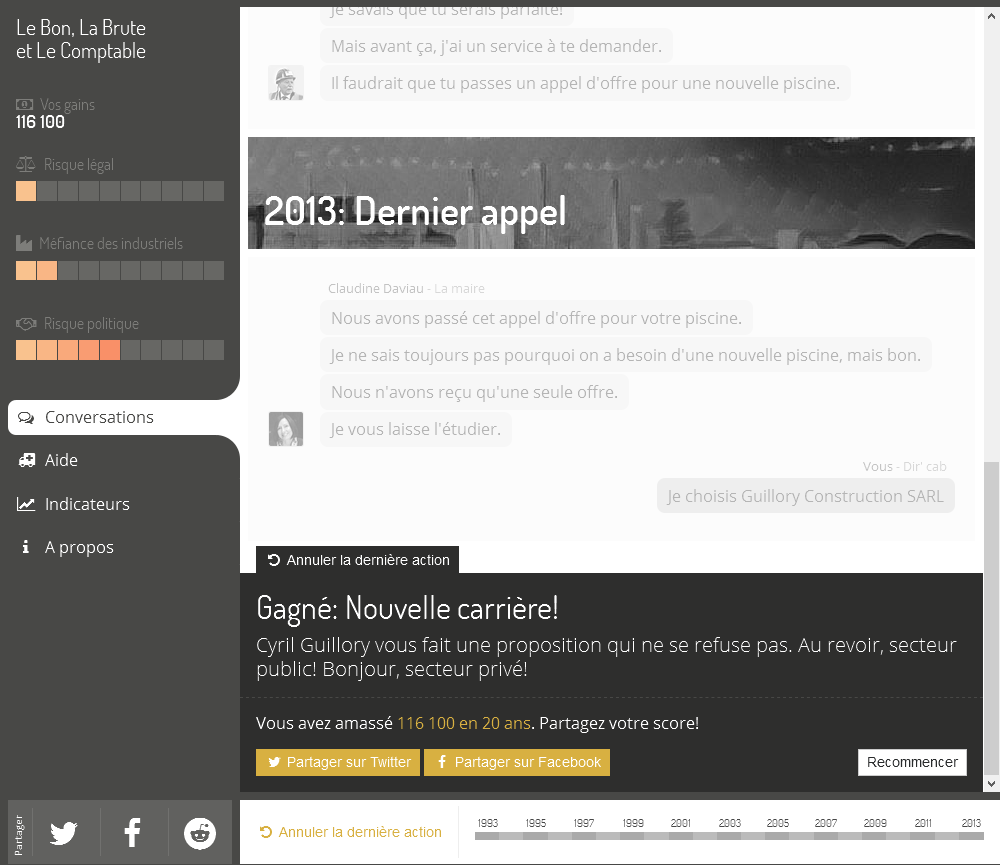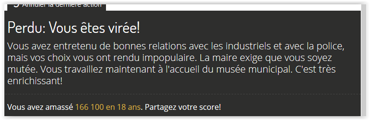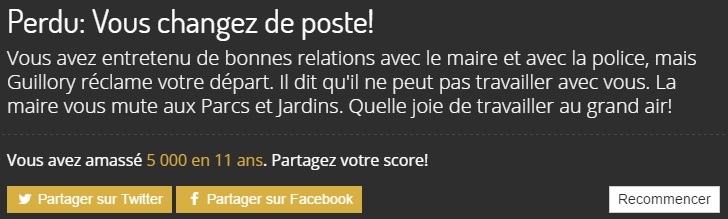 J'ai fait une première partie full honnête... j'ai pas duré longtemps, dès que la mairesse me demande de piocher dans les caisses pour sa com' perso je suis viré.