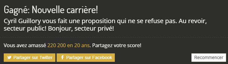 Tres sympa, j'ai fini viré apres 16 ans pour impopularité avec 4000 euros de deficit. Faudrait que j'essaye en mode grosse ordure.