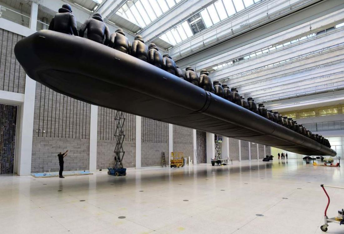 L'artiste représente notamment une installation immense avec 300 figurines grandeur nature noires, sont sur un bateau gonflable de 17 mètres de long.