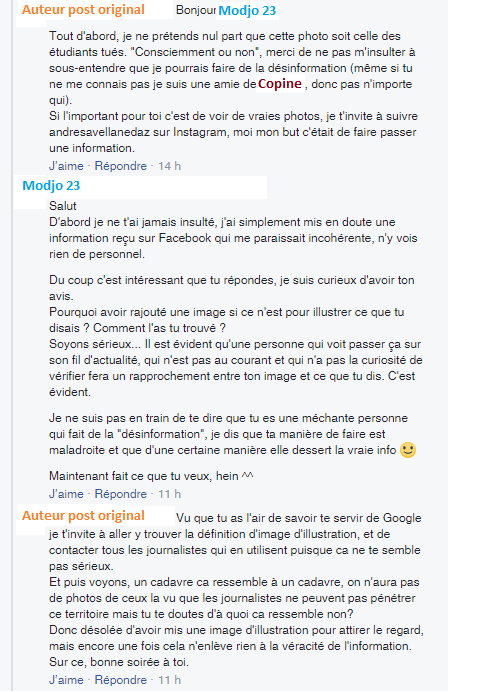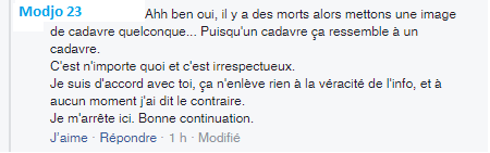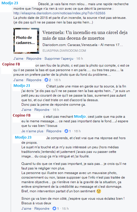 Hier soir je vois passer sur mon fil d'actualité FB un post partagé par une amie concernant les mouvements sociaux au Venezuela. Screen du post [ATTENTION PHOTO DE CADAVRES] Donc déjà les images de cadavres sur FB ça m'agasse, mais passons. Par réflexe (et puisque j'avais un peu de temps à perdre) je décide de vérifier l'image *clic droit* / "Rechercher une image avec google" Et ho ben 'tain... la photo correspond à un article de 2015 sur un incendie dans une prison au Venezuela. Donc bref à part le fait que ce soit dans le même pays, rien à voir avec la choucroute, vous en conviendrez. Du coup s'en suit cette conversation : ![]() Peu après, l'auteur du post original me tombe dessus : ![]() Ce à quoi je fini par répondre : ![]() Du coup si je poste ça ici, c'est pas juste pour raconter ma vie hein ![]() Je voulais avoir votre avis : - Est-ce que j'ai eu raison d'intervenir ? - Ai-je suffisamment mis les formes ? - Est-ce que c'est grave de publier des infos partiellement fausses sur les réseaux sociaux ? - Est-ce que l'auteur du post n'est pas complètement conne ? Je crois qu'il peut y avoir un vrai débat sur ce sujet, car les "fake news" pullulent sur le net et je pense que les gens doivent être sensibilisé à ça !