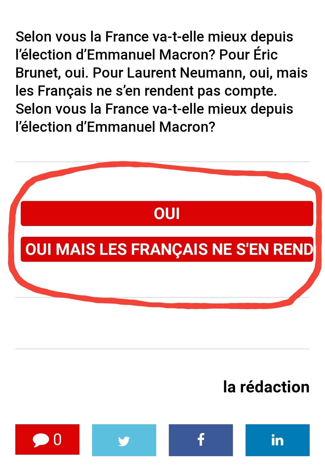 ![]() Lien pour vérifier qu'il ne s'agit pas de Fake : https://rmc.bfmtv.com/emission/selon-vous-la-france-va-t-elle-mieux-depuis-l-election-d-emmanuel-macron-648997.html?fbclid=IwAR0C0DM6gTHl9A2sjbSDc2GVZuLhTpuFeRG1lsJs_kBdoGGYK0oOcXc1FL0 https://twitter.com/ericbrunet/status/1222101072283652096?fbclid=IwAR0ZDeUNOXvFXtvcsZ32DJ6c4CKRCIDazW9erDzYmOog3Tnb_A_iVyknvqk Et après Macron se lamente que l'on se dise en dictature et que l'on exagère sur l'état politique de la France, je vois bien que les médias est une ligne éditoriale selon la couleur politique mais par pitié un sondage avec un vrai choix, même le point n'oserait pas (ou presque juste des questions orientés ou mal tournées). ![]()