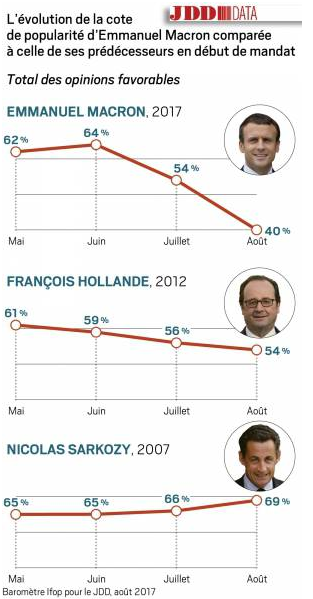 La côte de popularité de Macron est en chute libre. A comparaison avec ses prédécesseurs à la même période, il est le pire cas. En parallèle, on a une opposition très faible si ce n'est inexistante (la FI continue de se la jouer cavalier solitaire, ce que je trouve dangereux en plus de ridicule). Je pense que c'est un très très mauvais cocktail pour la démocratie, et ça promet une rentrée sociale très tendue. Et malgré ce que certains pensent, ce n'est pas du tout ce que je souhaite.