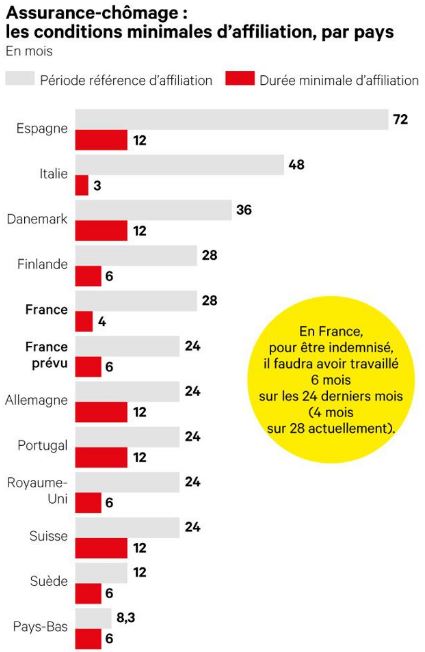 - mais aussi durcissement des conditions d'accès à l'indemnisation. Il faudra avoir travaillé l'équivalent de six mois durant les 24 mois précédents au lieu de quatre mois durant 28 mois actuellement.