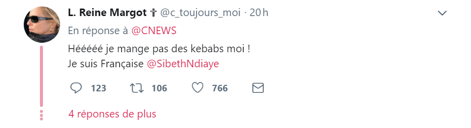 @Alex333 Je pense pas que ce soit spécialement réfléchi de sa part. Mais c'est évidemment maladroit puisqu'elle fait référence à un repas oriental, pas juste à un repas bon marché (sandwich par exemple). Ça peut être interprété en "les riches sont Français et mangent du homard, mais la plupart des gens sont des étrangers pauvres qui mangent des kebabs". Autrement dit "le kebab est le plat national des français pauvres".