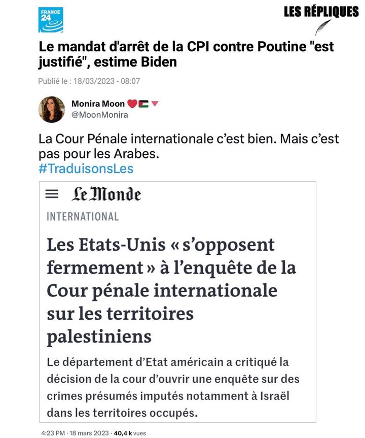 LeMonde... lol https://reseauinternational.net/la-cpi-veut-arreter-poutine-pour-avoir-mis-des-enfants-a-labri-loin-des-bombardements-des-fau/ Citation de l'article : Comme l’a dit le chef de la République tchétchène, Ramzan Kadyrov, il s’avère que pour la CPI bombarder et tuer délibérément des enfants n’est pas répréhensible si c’est fait par l’Ukraine, par contre, les sauver c’est de la déportation. « Il s’avère que les habitants du Donbass, y compris les enfants, étaient censés mourir sous les bombes des forces armées ukrainiennes et qu’ils ne devaient en aucun cas quitter les zones dangereuses. Ce n’est pas ma déclaration, c’est ce que pense la Cour Pénale Internationale de La Haye. Et sauver les enfants du Donbass est qualifié par eux de déportation. Bien sûr, j’ai toujours su et dit qu’en Occident qu’ils avaient tous la queue entre leurs jambes par peur des cow-boys, mais ici la nouvelle n’est pas étrange, mais plutôt ridiculement absurde : bombarder des enfants n’est pas un crime, mais les sauver, c’est de la déportation », a-t-il écrit sur sa chaîne Telegram. Il faut d’ailleurs rappeler que ces accusations délirantes de déportation d’enfants ont aussi été portées par l’Ukraine, quand les enfants de zones récemment libérées comme Marioupol, ont été envoyés en Russie pour les vacances d’été ! « Déportation » des plus étranges, car elle était approuvée par leurs parents, et ils en sont revenus ravis de ce qu’ils avaient vu et vécu pendant ces quelques semaines loin de la guerre ! Voir par exemple les enfants d’une école de Marioupol, qui sont allés en Russie pendant les vacances d’été, et racontent leur « déportation » lors de la rentrée des classes : [VIDÉO]