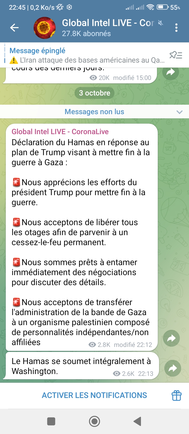 " le groupe affirme sa volonté de « contribuer de manière responsable » au « mouvement palestinien unifié » qui, selon lui, doit guider « l’avenir de la bande de Gaza ». Une position éloignée du projet américain, dont le treizième point statuait que « le Hamas et les autres factions s’engagent à ne jouer aucun rôle dans la gouvernance de Gaza, directement, indirectement ou sous quelque forme que ce soit »." extraits : Citation : « Le mouvement annonce son accord pour la libération de tous les prisonniers israéliens, vivants et morts, selon la formule d’échange contenue dans la proposition du président Trump, sous réserve que les conditions requises pour cet échange soient réunies », écrit le Hamas dans un communiqué. source un peu plus credible qu'un resumé d'un random message d'un groupe telegram. Et cette volonté d'etre impliqué peut etre tres largement problematique et un pretexte gratuit pour netanyahou de continuer, suivant le principe de l'accord qu'il a convenu tout seul avec trump : si ca se passe pas comme on le veut, on recommence. Perso, j'attendrais qq jours/Semaine avant de me prononcé sur le fait qu'on ai fait ou pas un pas en avant...