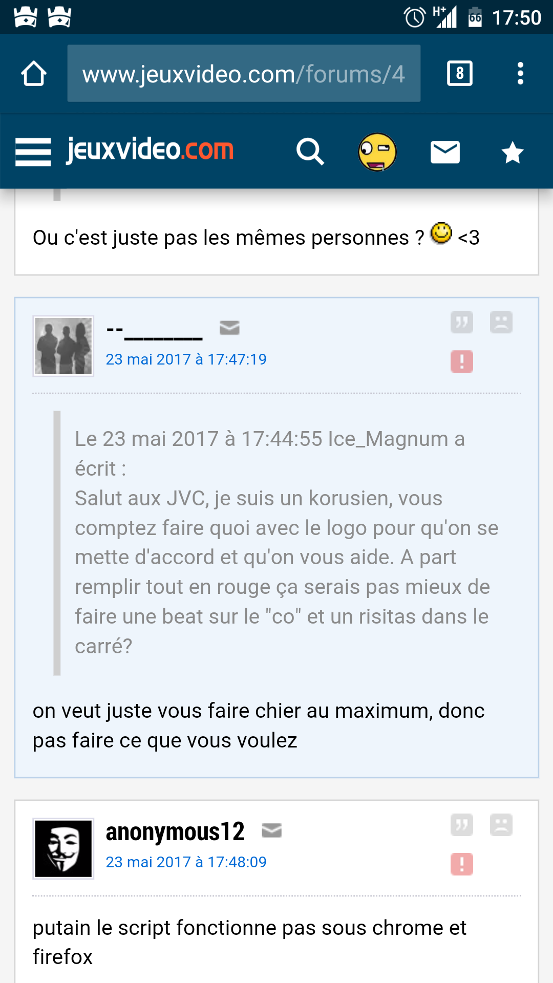 Du coup j'ai écris mon pseudo quelque part sans aucun lien avec le logo Koreus. Je découvre qu'il a été transformé en "Abruti" en moins de 10 heures, en aucun cas je vise JVC, je m'en fou de la gue-guerre, par contre c'est intéressant de voir que ça vient encore de la communauté française. C'est vraiment la pire des communauté sur le net .