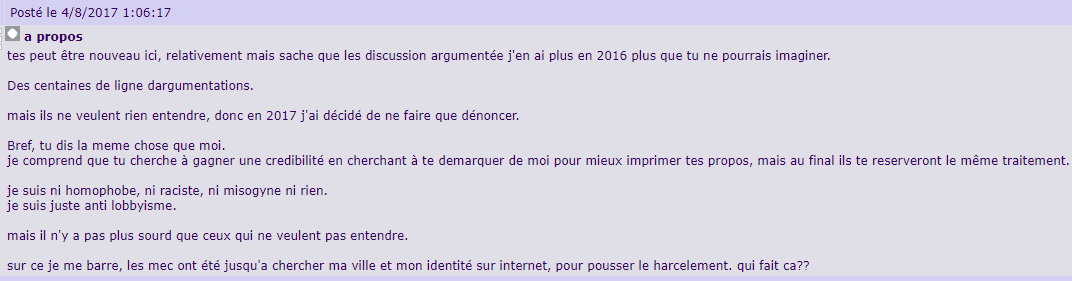 | Je masterise !    Inscrit: 21/01/2013 02:49 Post(s): 2827 Karma: 1690 | @Tgaud  Du harcèlement personnel sur les forums pour délit de pensée non conforme à la bienpensance C'est marrant que tu dises ça, me semblait qu'on s'était mis d'accord pour que tu arrêtes d'utiliser ce genre de sophisme dégeulasse et vexant ? Deux en une phrase d'ailleurs + J'ai écris "quasiment". J'ai évolué depuis l'époque ou je pensais que tu n'avais jamais posté sur d'autres sujets non polémique. Mais en plus tu ne le niais même pas, tu avouais toi même ne poster quasiment que sur ces sujets car les autres te semblaient sans intérêt, j'ai juste pas rebondis à ce moment là.