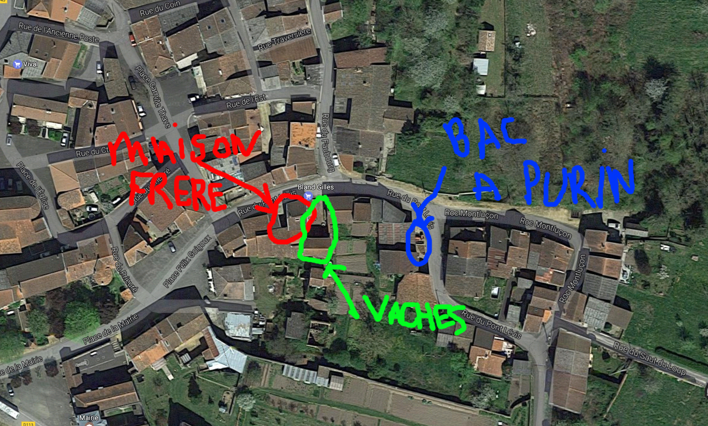 Faut pas juste voir "un pauvre agriculteur qui gagne 1000€ qui essaye tant bien que mal de s'en sortir avec des méchants voisins citadins qui lui font la misère" Il est installé depuis 2002. Il faudrait déjà savoir si il a reprit une exploitation existante et avec les mêmes conditions, la même production.... Visiblement c'était la maison de campagne des retraités ce qui invite a penser qu'ils étaient déjà la, dans leur maison, bien avant l'installation de cet agriculteur...Le truc, c'est que si ils venaient 1 mois l'été et les quelques longs w.e dans l'année, ils devaient faire abstraction d'éventuelles gènes de la part de l'agriculteur.... Mais une fois a la retraite et installés définitivement dans cette maison c'est donc prendre sur soit tout au long de l'année.... Donc avant de s'offusquer de la situation il faudrait savoir si l'exploitation avec des animaux existait de longue date et donc antérieur a la venue ou la vie des retraités dans leur maison de campagne. Si le jeune s'est ramené en 2012 alors qu'il n'y avait pas d'exploitation du genre a cet endroit (ça parait cependant qu'il ai eu des autorisations a l'époque si ce n'était pas le cas...) Enfin voila quoi! En savoir un peu plus! Si un mec vient s'installer en désespoir de cause a côté d'une ferme faut prendre avec les aléas par contre si il est tranquille au milieu de nul par et que demain vient s'installer une porcherie a 50m, la on peut comprendre le malaise! J'ai acheté une maison dans un petit village de campagne que je retape et mon frère a acheté une maison également a l'autre bout du village qui est aussi en réno et bien attenant a sa maison dans une cour, il y a le voisin qui y met ses vaches (Une qui a vêlé il y a peu dans cette même cour....qui se trouve en plein dans le village au milieu des habitations...et un peu plus loin un gros bac ou il met le purin, la aussi en plein milieu des habitations.... Alors que l'exploitation ai été la de père en fils avant tout le monde je n'en doute pas mais il y a peut être bien des normes qui obligent l'agriculteur a faire différemment non? Je suis étonné que la commune n'ai rien fait dans ce sens! J'imagine que mon frère va pas souvent ouvrir les fenêtres quand il habitera la bas! ![]() ![]() la maison de mon frère cadrée en rouge sur la deuxième photo edit: Citation :