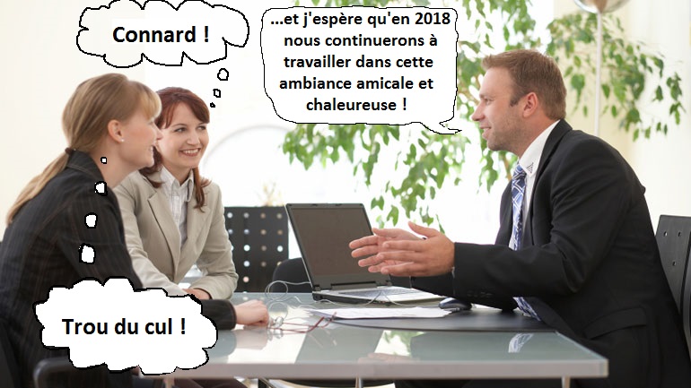 -Du coup, on va augmenter vos salaires ! (Ptain d'égalité homme-femme mon cul ! 10 ans que je les sous-paies et maintenant je peux pas les virer, heureusement que Martine me fuce la pite quand je veux...) -Ah finalement ! Les syndicats ont du bons ! (Fais genre, SALAUD ! On t'aura !) -On a bien compris que ça venait pas de vous, vous êtes juste un autre "employé" comme nous ! (Maman avait raison ! Ca paie de s'investir sous-le-bureau !" EDITHE: je comptais pas participer parce que je trouvais mon idée trop limite, mais bon, vu qu'on s'en fout ici et que le jeu (est) coule (cool) Patapé plz, c'est de "l'humour"