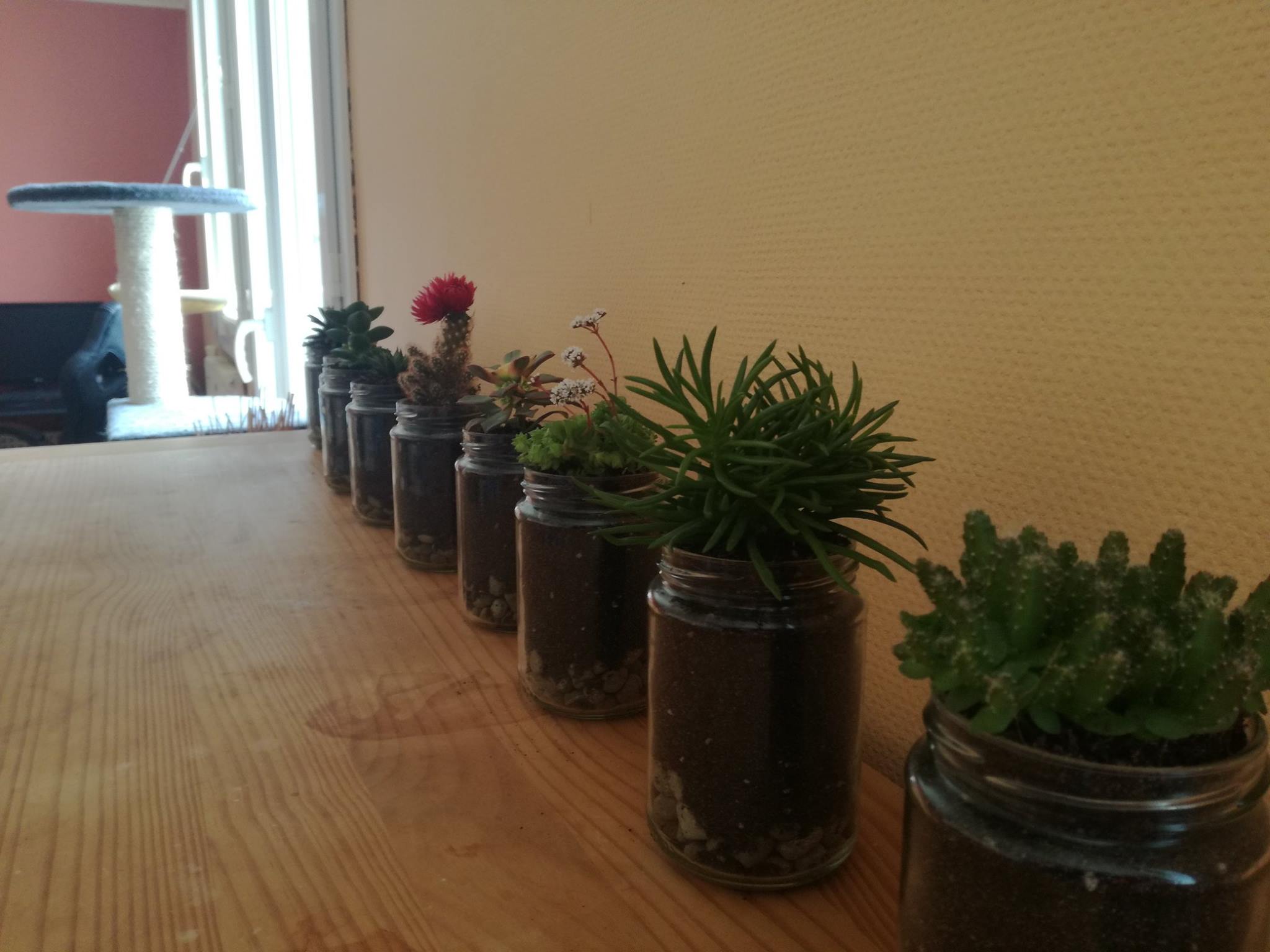 J'ai profité de ce dimanche pluvieux pour recycler des pots de pâte à tartiner pour y rempoter un lot de cactus et plantes succulentes, rien de bien compliqué mais le rendu est sympathique