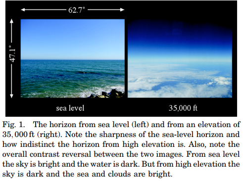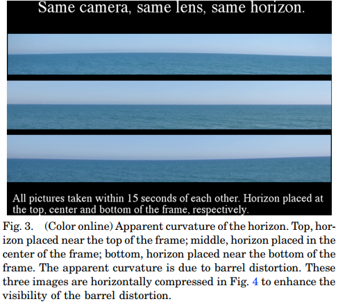 Le résumé : Citation : Reports and photographs claiming that visual observers can detect the curvature of the Earth from high mountains or high-flying commercial aircraft are nvestigated. Visual daytime observations show that the minimum altitude at which curvature of the horizon can be detected is at or slightly below 35; 000 ft, providing that the field of view is wide (60°) and nearly cloud free. The high-elevation horizon is almost as sharp as the sea-level horizon, but its contrast is less than 10% that of the sea-level horizon. Photographs purporting to show the curvature of the Earth are always suspect because virtually all camera lenses project an image that suffers from barrel distortion. To accurately assess curvature from a photograph, the horizon must be placed precisely in the center of the image, i.e., on the optical axis 35 000 ft = 10.6 km ![]()