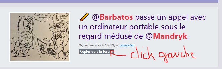 Je croyais qu'on devait attendre 48h??? Labise @Wiliwilliam j'ai refait un truc du coup et je n'arrive toujours pas à le mettre sur le forum... et je m'en garde un sous le coude... @Barbatos passe un appel avec un ordinateur portable sous le regard médusé de @Mandryk. ![]() - Défi réalisé le 28-07-2020 par poussinlex - Ok, merci, je pensais que ça se faisait automatiquement --' Et merci pour le compliment, je ne dessine plus beaucoup depuis que je travaille sur ordinateur en 3D...
