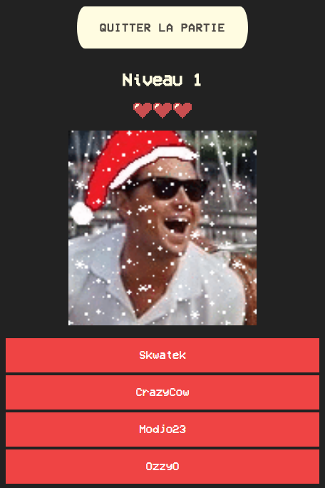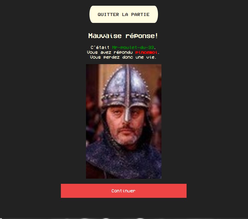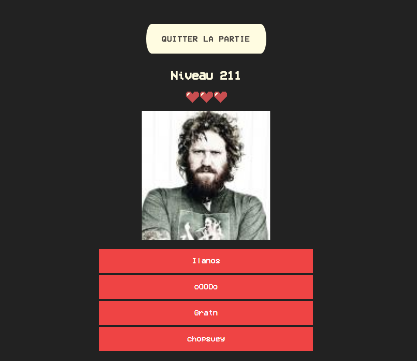 Idées d'ajouts : même mode de jeu mais le contraire, un pseudo 4 choix d'avatars. Un mode "entrainement", ça continue non stop sans recommencer à 3 mauvaises réponses. Un mode blind test, 30 questions et on a la réponse qu'à la fin des 30.