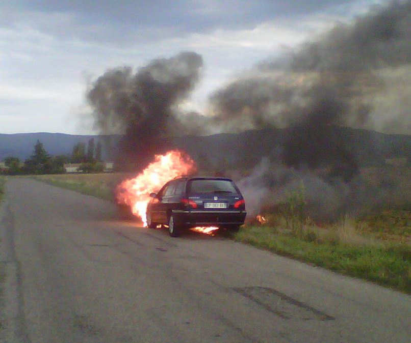 Cet été, mi-août, avec ma femme, ma fille et ma 406 en qui j’avais une confiance aveugle. Sur une petite route non loin de Valence, commune de Chabeuil,, perte de vitesse, je regarde dans le rétro pour pas qu’on me tape au cul, je vois de la fumée noire (DANGER !!). Je stoppe le véhicule et le contact, fumée noire dans l’habitacle, je dis très calmement à ma femme de sortir la petite et de s’éloigner. Je regarde sous la voiture => des flammes s’échappent sous le moteur. Je me casse au loin et je fais le 18…