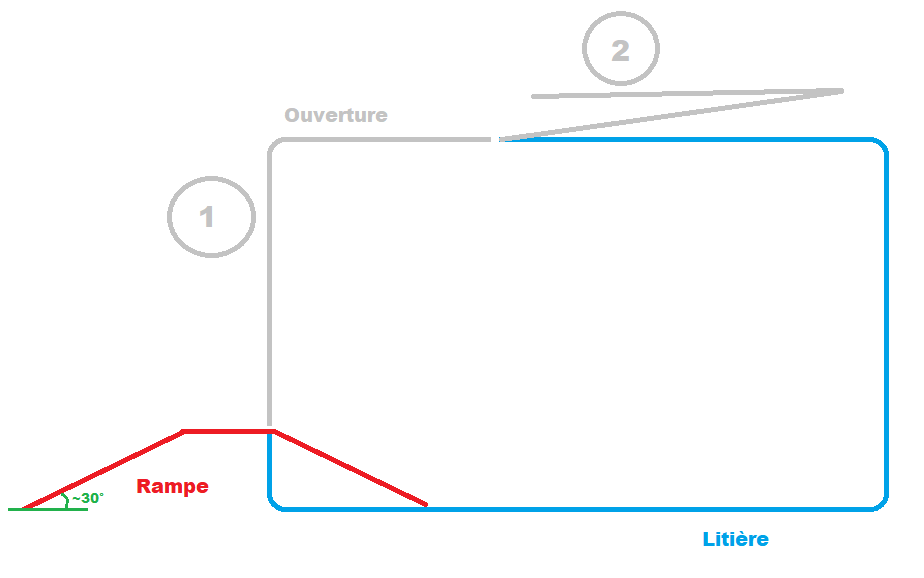 Yep, c'est une bonne idée si tu es un peu bricolo. Ou même, tu peux bricoler une sorte de petite rampe. Celle à l'intérieur serait un peu souillée, mais si tu choisis un matériau de type métal ou plastique, ça se lavera facilement. Une pente à ~30° devrait passer si ton chat a des difficultés à se déplacer. Et si c'est vraiment compliqué pour lui de passer l'ouverture battante, tu peux la relever, si tu as le même modèle que celui que j'avais. ![]()