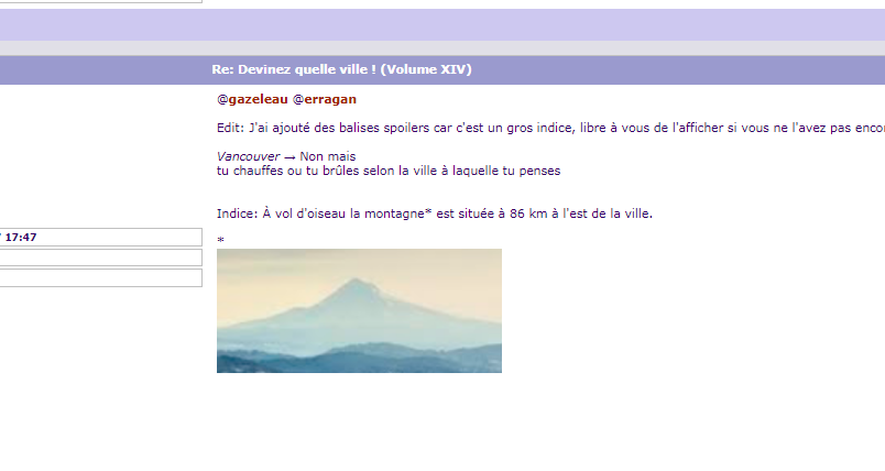 Edit: J'ai ajouté des balises spoilers car c'est un gros indice, libre à vous de l'afficher si vous ne l'avez pas encore vu. Vancouver → Non mais tu chauffes ou tu brûles selon la ville à laquelle tu penses Indice: À vol d'oiseau la montagne* est située à 86 km à l'est de la ville. * ![]()